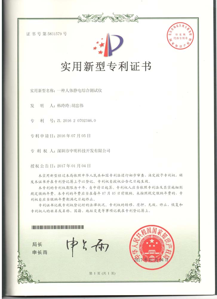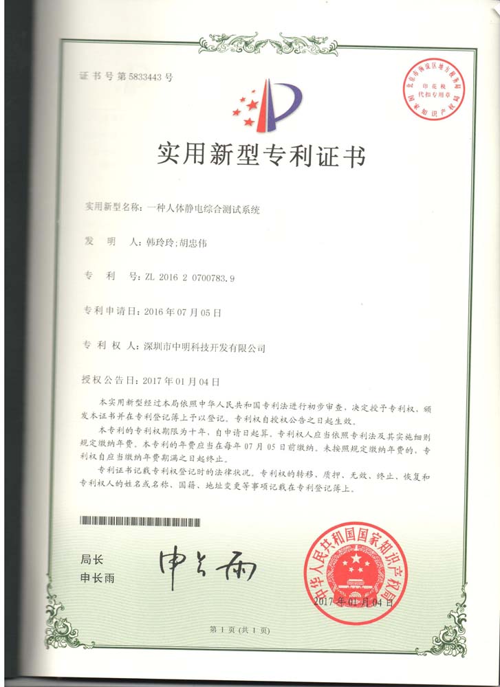 經過全體同仁的共同努力,公司自主研發(fā)的人體綜合測試儀、防靜電用品監(jiān)測設備及系統(tǒng)、網絡型地線監(jiān)測儀、防靜電隔離裝置、防靜電用品測溫裝置及系統(tǒng)分別獲得了國家知識產權書明頒發(fā)的“實用新型專利證書”。