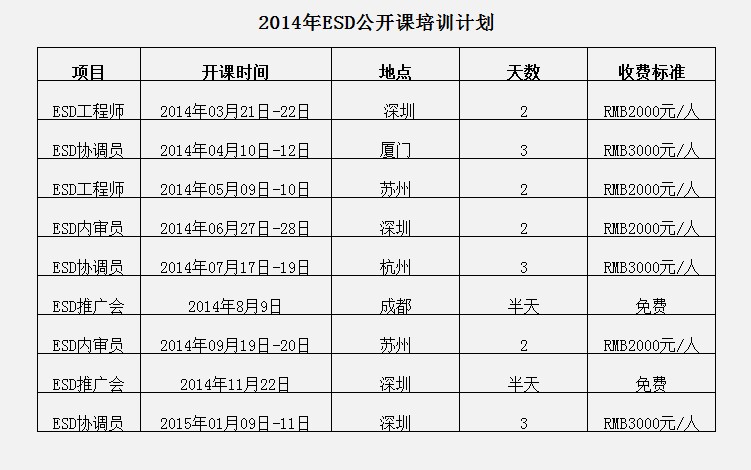 為迎合各企業(yè)2014年ESD培訓(xùn)需求,博瑞思制定了相關(guān)的ESD公開課培訓(xùn)計(jì)劃,敬請(qǐng)各位查閱!歡迎各位踴躍報(bào)各!再此感謝以往支持、正在支持及后續(xù)支持博瑞思的客戶!也祝各企業(yè)2014年生意興隆,財(cái)源廣進(jìn)!