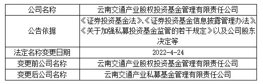 2、公司名稱由“云南交通產(chǎn)業(yè)股權(quán)投資基金管理有限責(zé)任公司”變更為“云南交通產(chǎn)業(yè)私募基金管理有限責(zé)任公司”,公司股權(quán)結(jié)構(gòu)、公司法定代表人不變,業(yè)務(wù)主體、注冊(cè)地址、銀行賬號(hào)、聯(lián)系方式等事項(xiàng)均保持不變;公司章程的有關(guān)條款已隨名稱變更進(jìn)行了相應(yīng)修改。