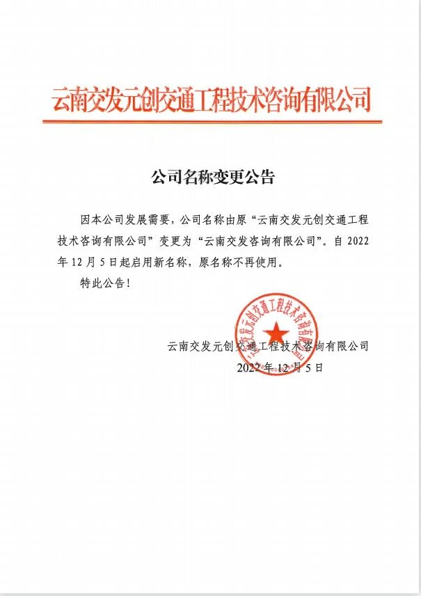 云南交發(fā)元?jiǎng)?chuàng)交通工程技術(shù)咨詢有限公司名稱變更公告