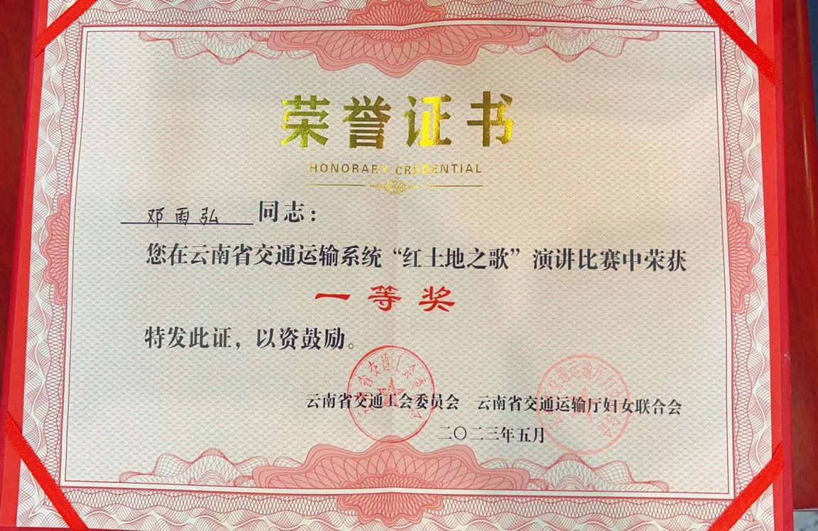 本次演講比賽由省交通工會和省交通運輸廳婦女聯(lián)合會主辦,來自全省交通運輸系統(tǒng)的32名優(yōu)秀選手參加角逐,講述了全省交通系統(tǒng)干部職工在基層一線和本職工作崗位上做出突出成績和可歌可泣的感人故事。鄧雨弘在演講中以思念去世的奶奶為情感主線,回顧了老家從“沒有路”到有了農(nóng)村公路,再到四通八達(dá)的高速路的歷史變遷過程,講述了自己在本職崗位上參加高速公路建設(shè)的經(jīng)歷,抒發(fā)了自身兢兢業(yè)業(yè)、默默耕耘建設(shè)交通強國的豪邁氣概,給觀眾和評委留下了深刻印象,最終獲得了一等獎。
