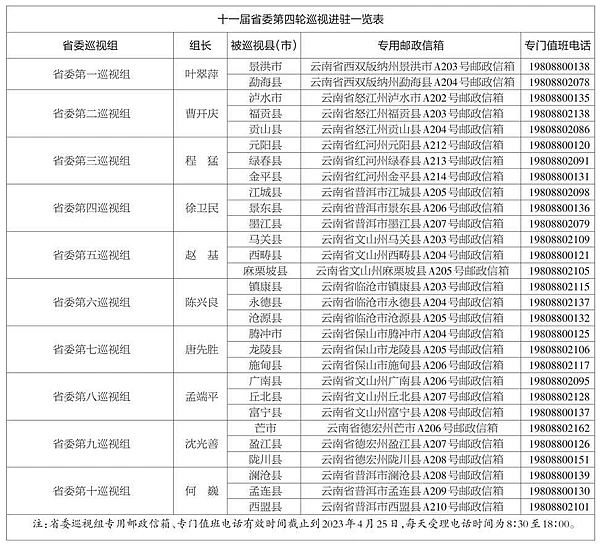 截至3月10日,省委10個(gè)巡視組分別完成對騰沖市、施甸縣、龍陵縣、元陽縣、綠春縣、金平苗族瑤族傣族自治縣、西疇縣、麻栗坡縣、馬關(guān)縣、丘北縣、廣南縣、富寧縣、墨江哈尼族自治縣、景東彝族自治縣、江城哈尼族彝族自治縣、瀾滄拉祜族自治縣、孟連傣族拉祜族佤族自治縣、西盟佤族自治縣、景洪市、勐??h、芒市、盈江縣、隴川縣、瀘水市、福貢縣、貢山獨(dú)龍族怒族自治縣、永德縣、鎮(zhèn)康縣、滄源佤族自治縣進(jìn)駐,十一屆省委第四輪巡視全面展開。