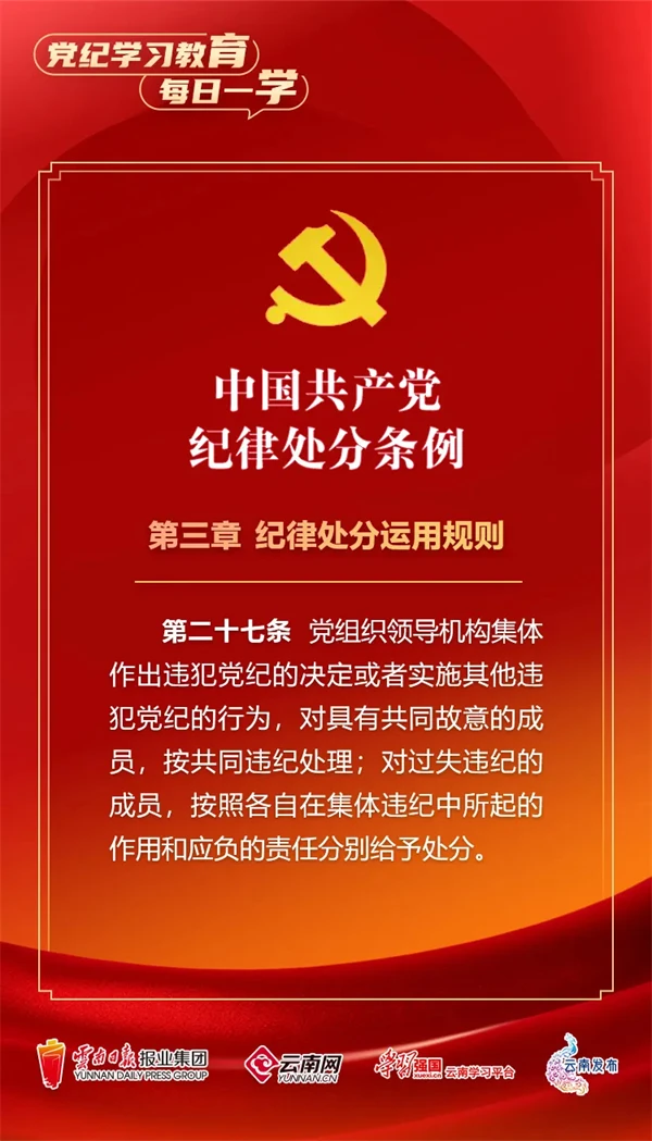 編者按:為深入學(xué)習(xí)貫徹落實(shí)習(xí)近平總書記關(guān)于黨紀(jì)學(xué)習(xí)教育的重要講話和重要指示精神,便于全省各級(jí)黨組織和廣大黨員、干部深入學(xué)習(xí)貫徹修訂后的《中國(guó)共產(chǎn)黨紀(jì)律處分條例》,云南網(wǎng)、“學(xué)習(xí)強(qiáng)國(guó)”云南學(xué)習(xí)平臺(tái)、云南發(fā)布共同策劃推出“黨紀(jì)學(xué)習(xí)教育•每日一學(xué)”專欄,營(yíng)造全員參與、人人學(xué)紀(jì)的濃厚氛圍。今天,我們推出第?期,一起來(lái)學(xué)習(xí)。