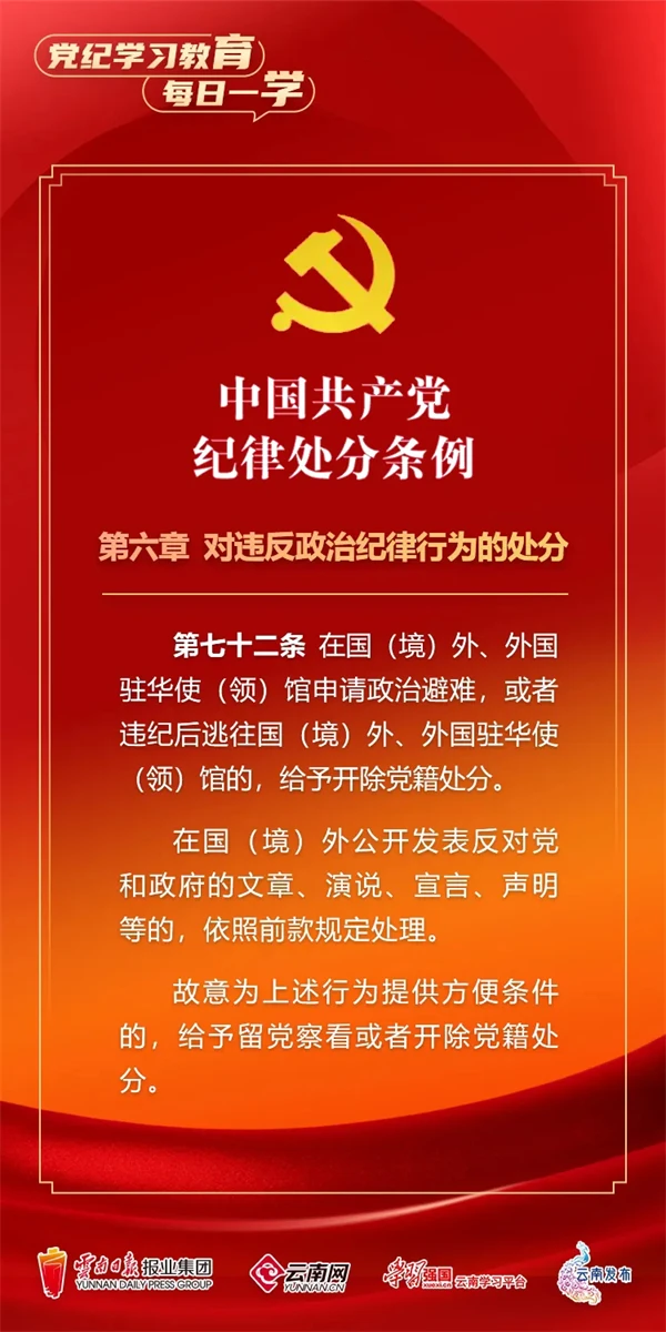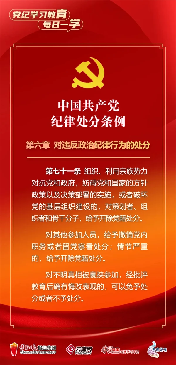 為深入學習貫徹落實習近平總書記關(guān)于黨紀學習教育的重要講話和重要指示精神,便于全省各級黨組織和廣大黨員、干部深入學習貫徹修訂后的《中國共產(chǎn)黨紀律處分條例》,云南網(wǎng)聯(lián)合“學習強國”云南學習平臺、云南發(fā)布共同策劃推出“黨紀學習教育·每日一學”專欄,營造全員參與、人人學紀的濃厚氛圍。今天,我們推出第?期,一起來學習。
