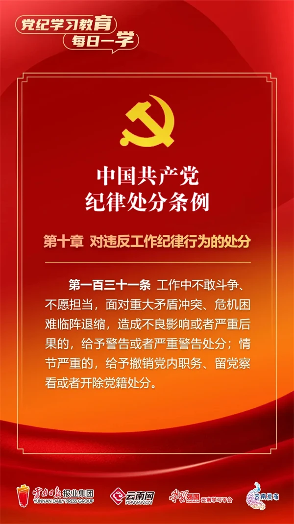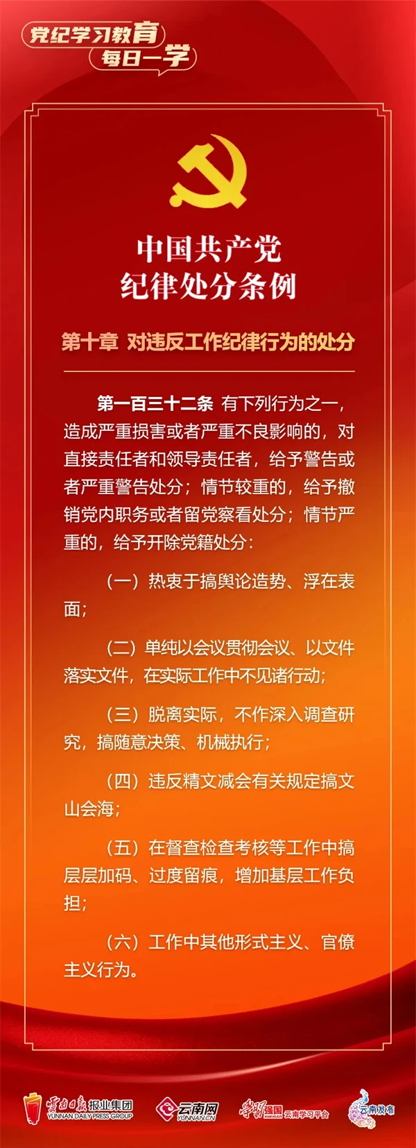 為深入學(xué)習(xí)貫徹落實(shí)習(xí)近平總書記關(guān)于黨紀(jì)學(xué)習(xí)教育的重要講話和重要指示精神,便于全省各級黨組織和廣大黨員、干部深入學(xué)習(xí)貫徹修訂后的《中國共產(chǎn)黨紀(jì)律處分條例》,云南網(wǎng)聯(lián)合“學(xué)習(xí)強(qiáng)國”云南學(xué)習(xí)平臺(tái)、云南發(fā)布共同策劃推出“黨紀(jì)學(xué)習(xí)教育•每日一學(xué)”專欄,營造全員參與、人人學(xué)紀(jì)的濃厚氛圍。今天,我們推出第62期,一起來學(xué)習(xí)。