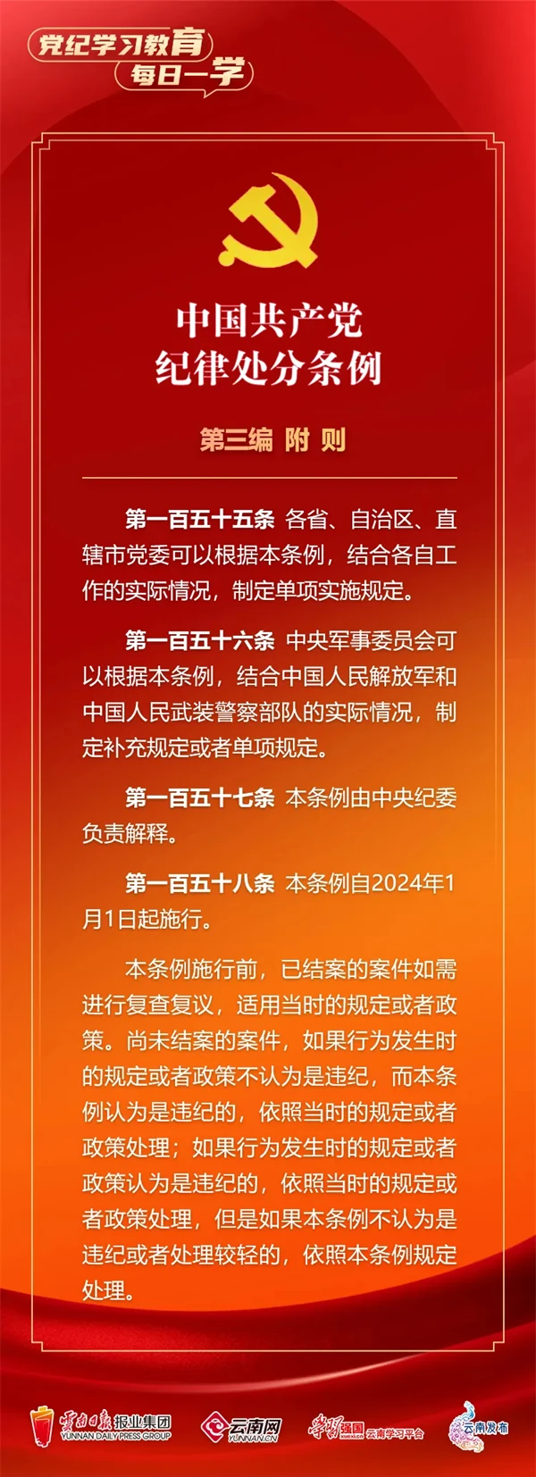 為深入學習貫徹落實習近平總書記關于黨紀學習教育的重要講話和重要指示精神,便于全省各級黨組織和廣大黨員、干部深入學習貫徹修訂后的《中國共產黨紀律處分條例》,云南網聯(lián)合“學習強國”云南學習平臺、云南發(fā)布共同策劃推出“黨紀學習教育•每日一學”專欄,營造全員參與、人人學紀的濃厚氛圍。今天,我們推出第74期,一起來學習。