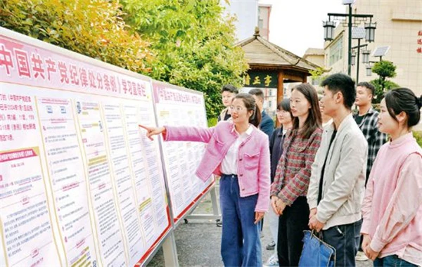 在全黨開展黨紀(jì)學(xué)習(xí)教育,是加強(qiáng)黨的紀(jì)律建設(shè)、推動(dòng)全面從嚴(yán)治黨向縱深發(fā)展的重要舉措。連日來,各地區(qū)各部門各單位精心謀劃部署、抓住學(xué)習(xí)重點(diǎn),推動(dòng)黨紀(jì)學(xué)習(xí)教育走深走實(shí)。圖為2024年4月10日,江西省蘆溪縣紀(jì)委監(jiān)委干部在《中國(guó)共產(chǎn)黨紀(jì)律處分條例》學(xué)習(xí)宣傳欄前交流。 鄧建萍/攝