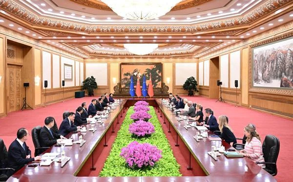 7月24日上午,國家主席習近平在北京人民大會堂會見來華舉行第二十五次中國-歐盟領導人會晤的歐洲理事會主席科斯塔和歐盟委員會主席馮德萊恩。新華社記者 李響 攝