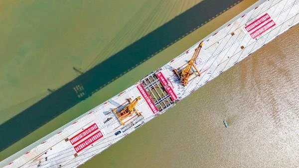 橋位區(qū)地質(zhì)條件復(fù)雜,臨水臨崖,施工場(chǎng)地狹窄,常年受峽谷強(qiáng)風(fēng)影響。為攻克難題,建設(shè)團(tuán)隊(duì)創(chuàng)造性采用了“現(xiàn)澆鋼混組合橋面板+鋼桁架地板桁結(jié)合主梁”形式和“空中散拼三步法”,實(shí)現(xiàn)桁片精準(zhǔn)“翻身就位”。同時(shí),構(gòu)建“線上智能監(jiān)控系統(tǒng)”動(dòng)態(tài)調(diào)整斜拉索張拉力及鋼桁梁安裝高程,確保橋梁線性控制精準(zhǔn),最終在百米高空實(shí)現(xiàn)難度極高的毫米級(jí)精度合龍。