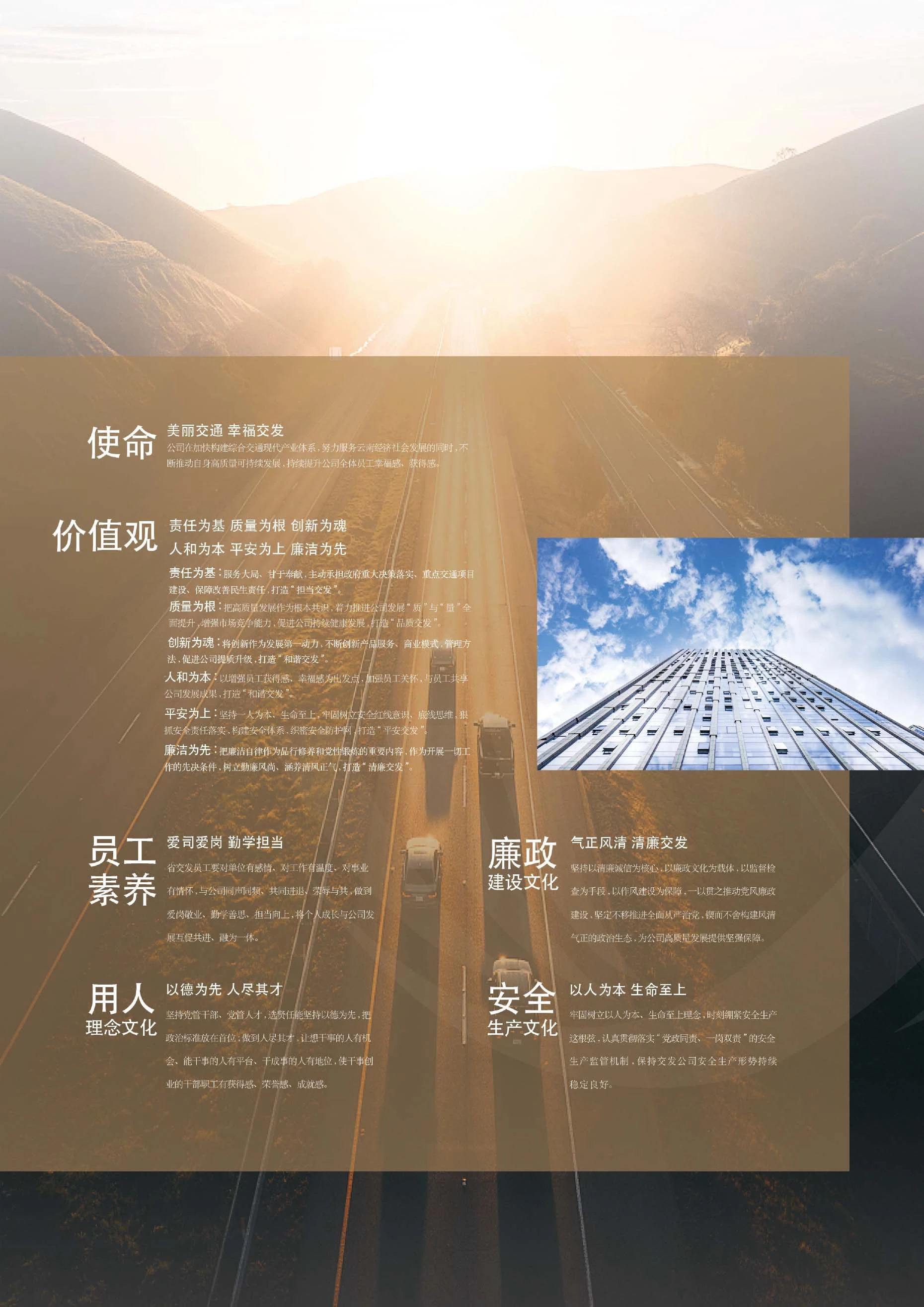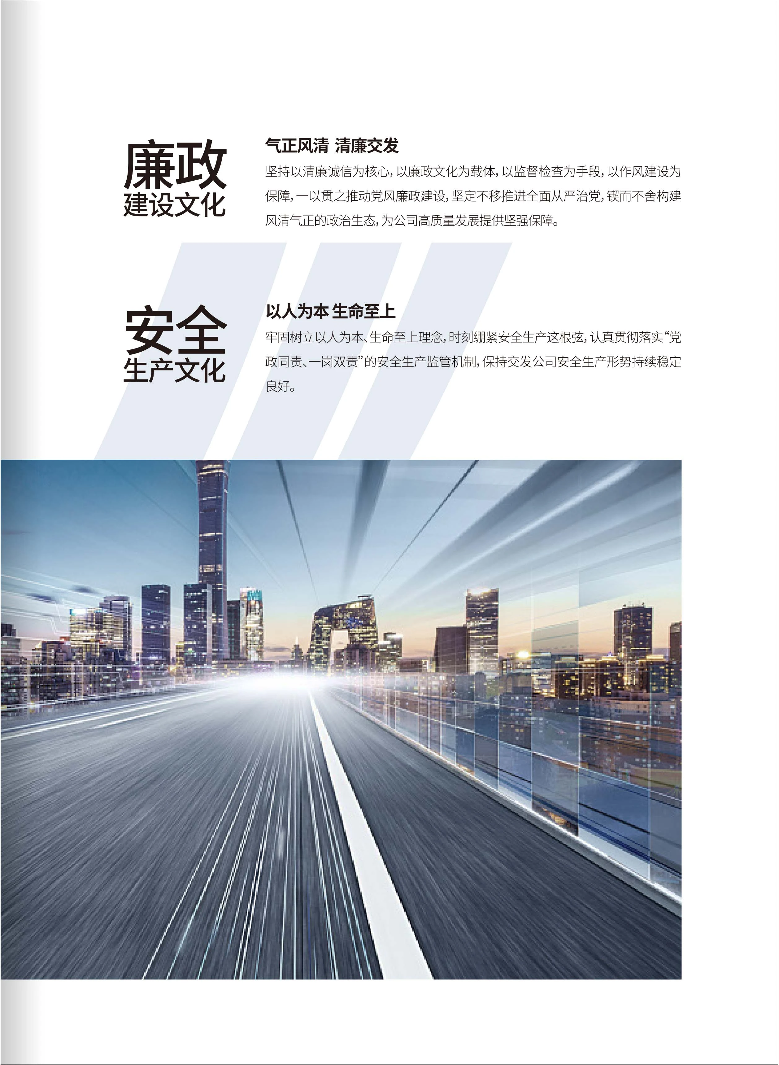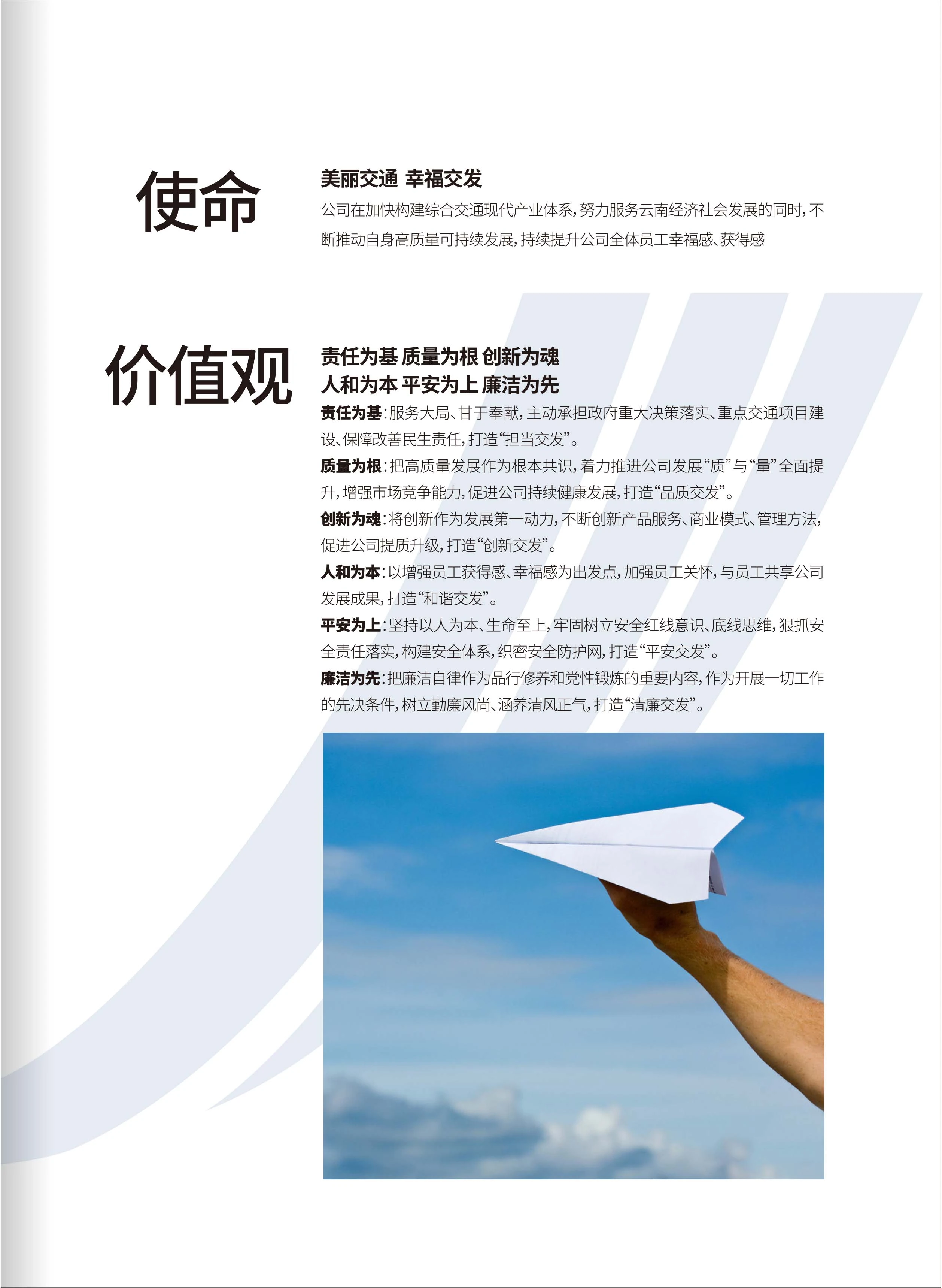 以“規(guī)模提升、集采集供、品類拓展”為發(fā)展思路,依托交通主業(yè)擴(kuò)大物資貿(mào)易業(yè)務(wù)規(guī)模;以“價(jià)值挖潛、品牌提升、延伸拓展”為發(fā)展核心,深挖路域資源全面提升運(yùn)營管理水平;以“開放合作、創(chuàng)新發(fā)展、精品打造”為發(fā)展目標(biāo),聚焦優(yōu)勢資源持續(xù)深化對(duì)外合作;堅(jiān)持“高起點(diǎn)、高質(zhì)量、高水平”發(fā)展要求,創(chuàng)新“交通產(chǎn)業(yè)+資源整合+資本嫁接”商業(yè)模式,著力構(gòu)建成為一體多元企業(yè)%,有多個(gè)項(xiàng)目獲獎(jiǎng)。其中,昆玉高速公路獲2003年“中國建筑工程魯班獎(jiǎng)”;硯平高速公路獲2006年度“國家優(yōu)質(zhì)工程銀質(zhì)獎(jiǎng)”;安楚高速公路獲2007年度“國家優(yōu)質(zhì)工程銀質(zhì)獎(jiǎng)”獎(jiǎng)項(xiàng)。