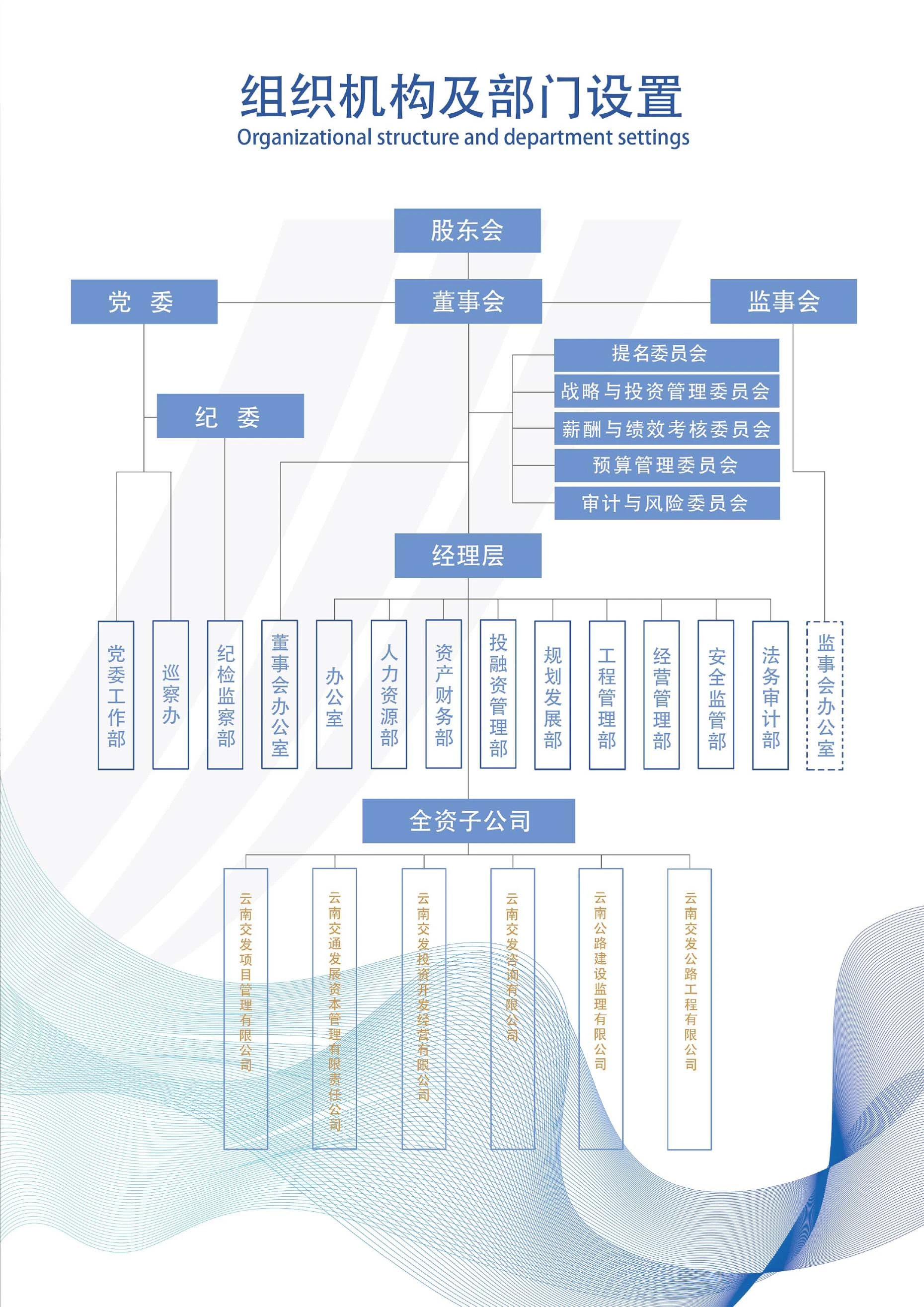 云南交發(fā)投資開發(fā)經(jīng)營有限公司于2018年1月30日成立,注冊(cè)資本金10億元,為云南省交通發(fā)展投資有限責(zé)任公司全資子公司,公司內(nèi)設(shè)6個(gè)部門,下設(shè)全資、控股、合資企業(yè)5個(gè)。